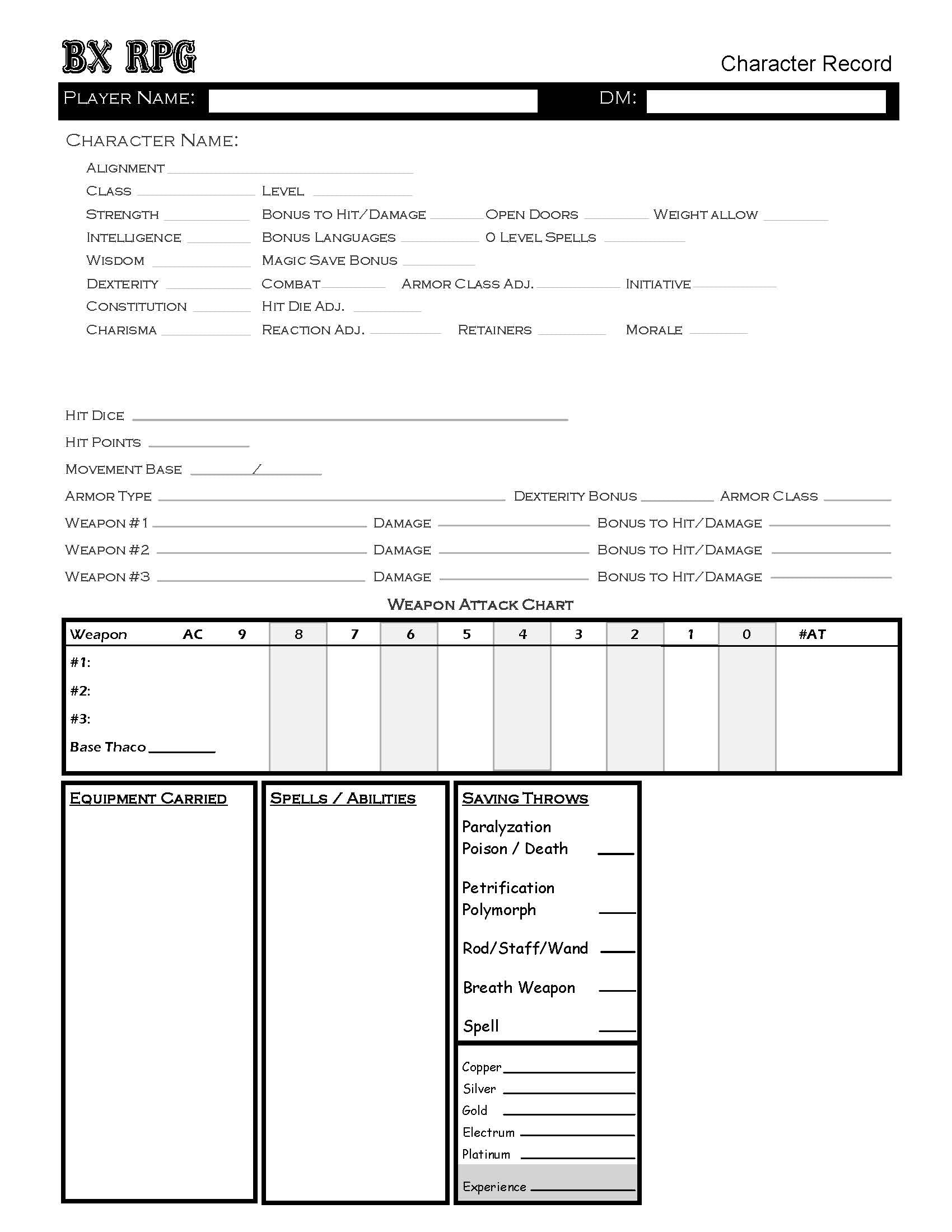 This character sheet designed by Pacesetter's own Bill Barsh is to be used for the B/X game system!