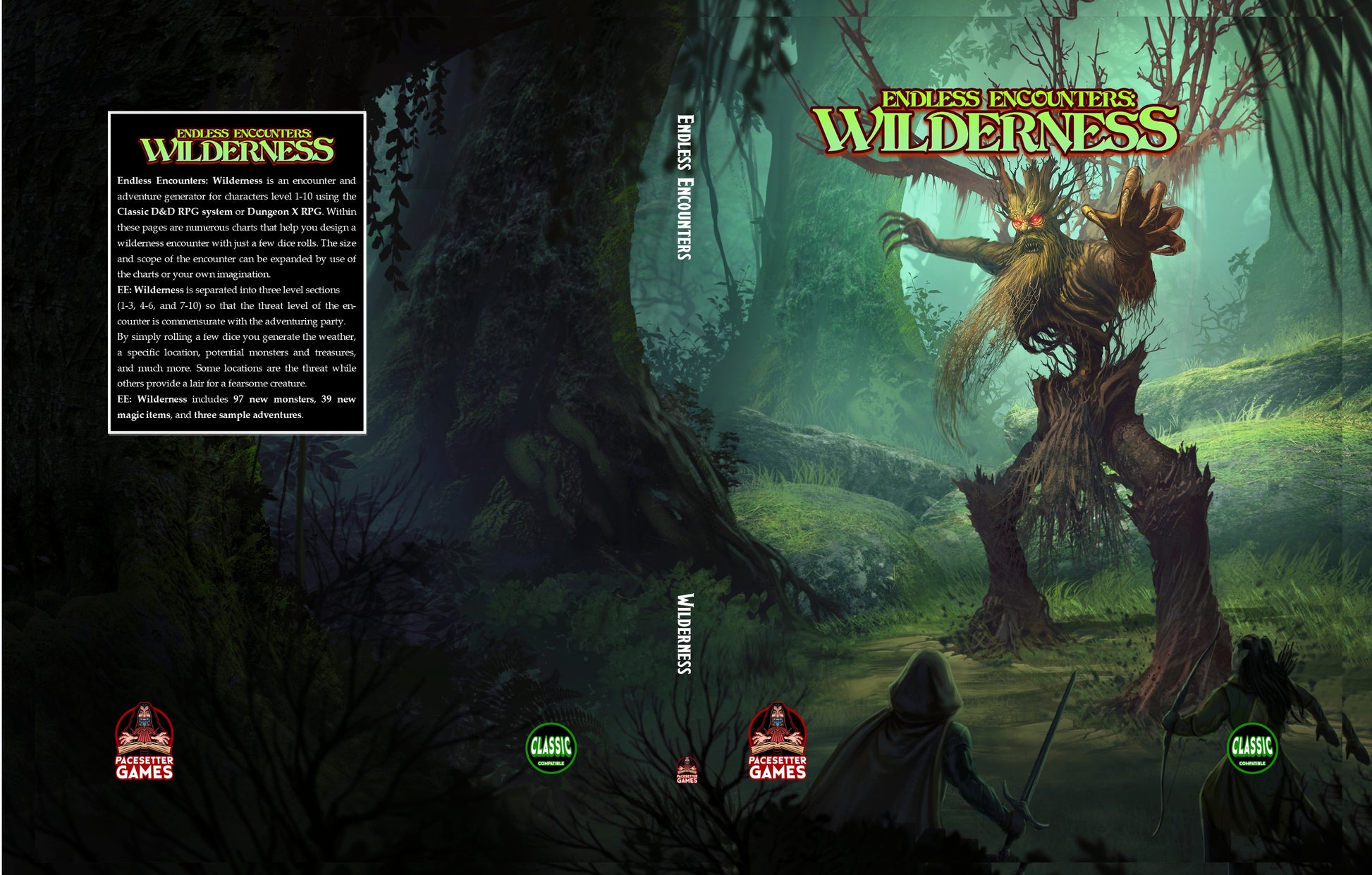 Charts include everything you need to create an amazing encounter including illumination, room type, room contents, traps, monsters (full statistic blocks), treasures, and much more. EE: Dungeons also has 30 new monsters and 30 new magical items! Of course there is more in the form of several complete forest-based adventures. EE: Wilderness is designed for use with the BX RPG and compatible with all other OSR classic game systems based on the world’s largest fantasy RPG. This book is also fully compatible with Pacesetter's upcoming Dungeon X RPG.
