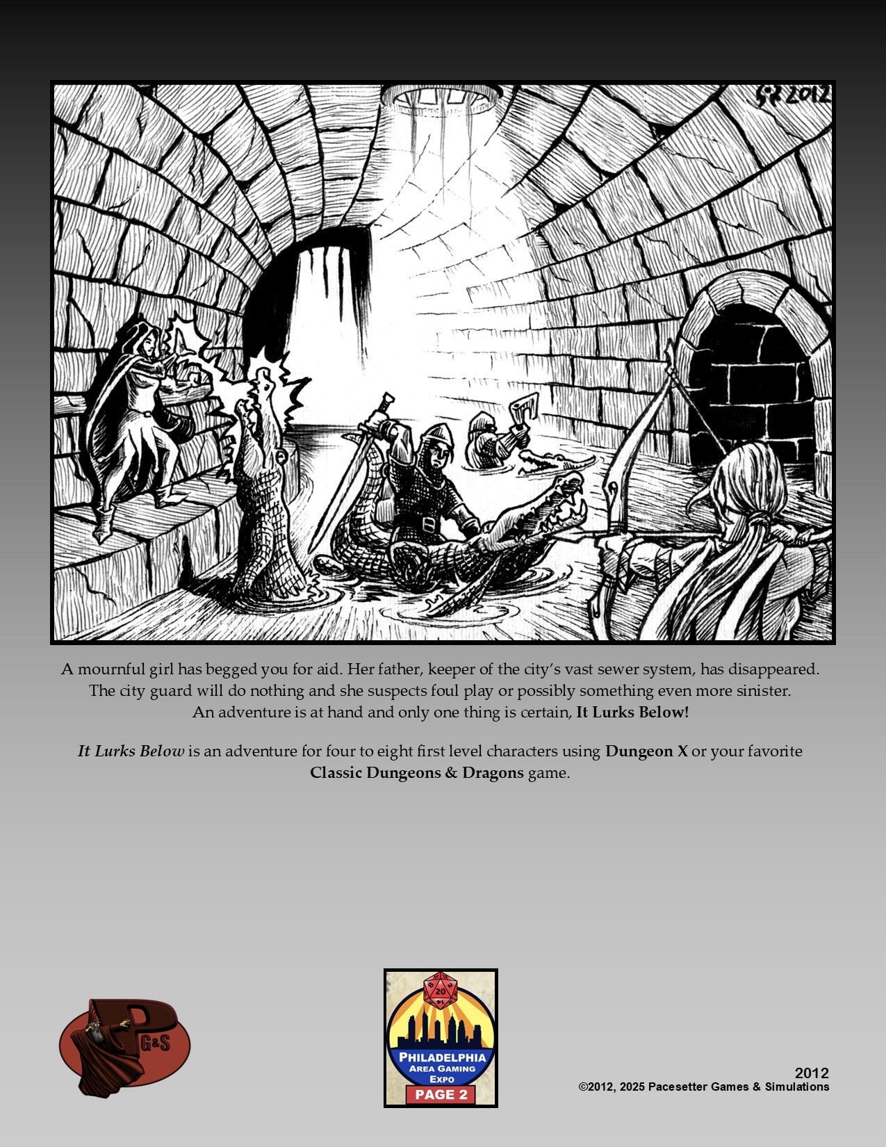 It Lurks Below is an adventure for four to eight first level characters using Dungeon X or your favorite Classic Dungeons & Dragons game.
