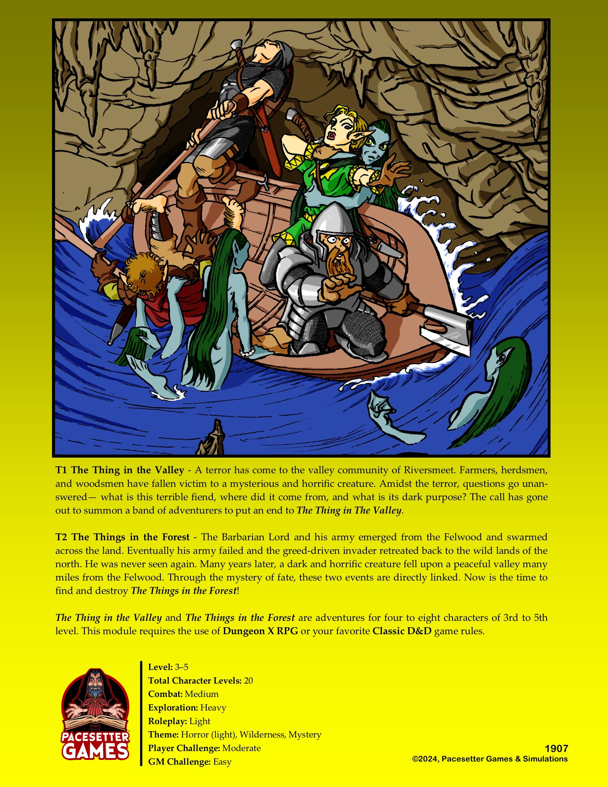 T1 The Thing in the Valley - A terror has come to the valley community of Riversmeet. Farmers, herdsmen, and woodsmen have fallen victim to a mysterious and horrific creature. Amidst the terror, questions go unanswered -- what is this terrible fiend, where did it come from, and what is its dark purpose? The call has gone out to summon a band of adventurers to put an end to The Thing in The Valley.