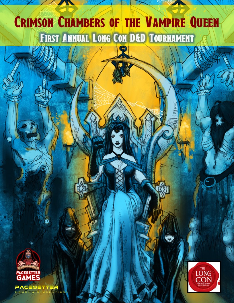 Crimson Chambers of the Vampire Queen is a redesign of the first level of the iconic Palace of the Vampire Queen adventure module by Wee Warriors; it was the first adventure module produced for Dungeons & Dragons. This tournament version that was run at the 2022 Long Con Game Convention held in Longview, Texas.